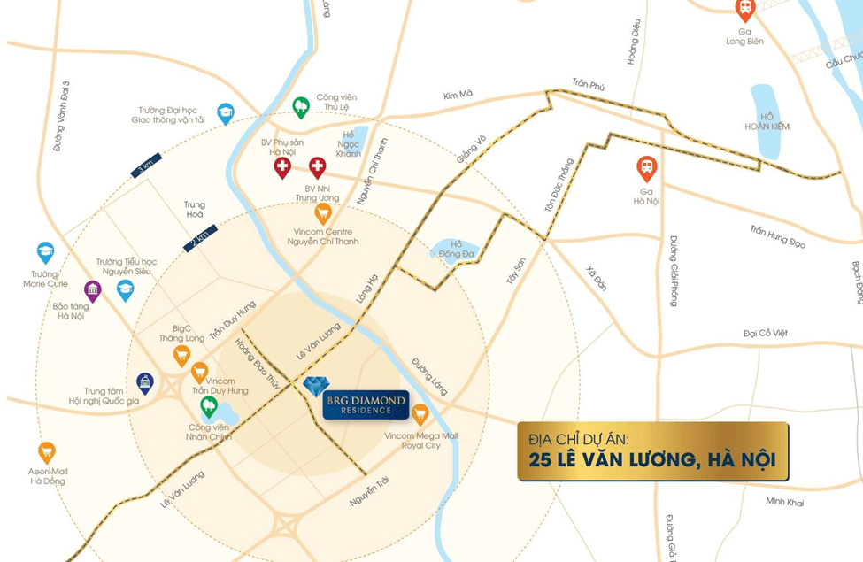 Xung quanh dự án BRG Diamond Residence là hệ thống các tuyến đường huyết mạch của thành phố Hà Nội như Lê Văn Lương, Hoàng Đạo Thuý, Trần Duy Hưng, Nguyễn Trãi, Khuất Duy Tiến, Phạm Hùng, Vành đai 3…